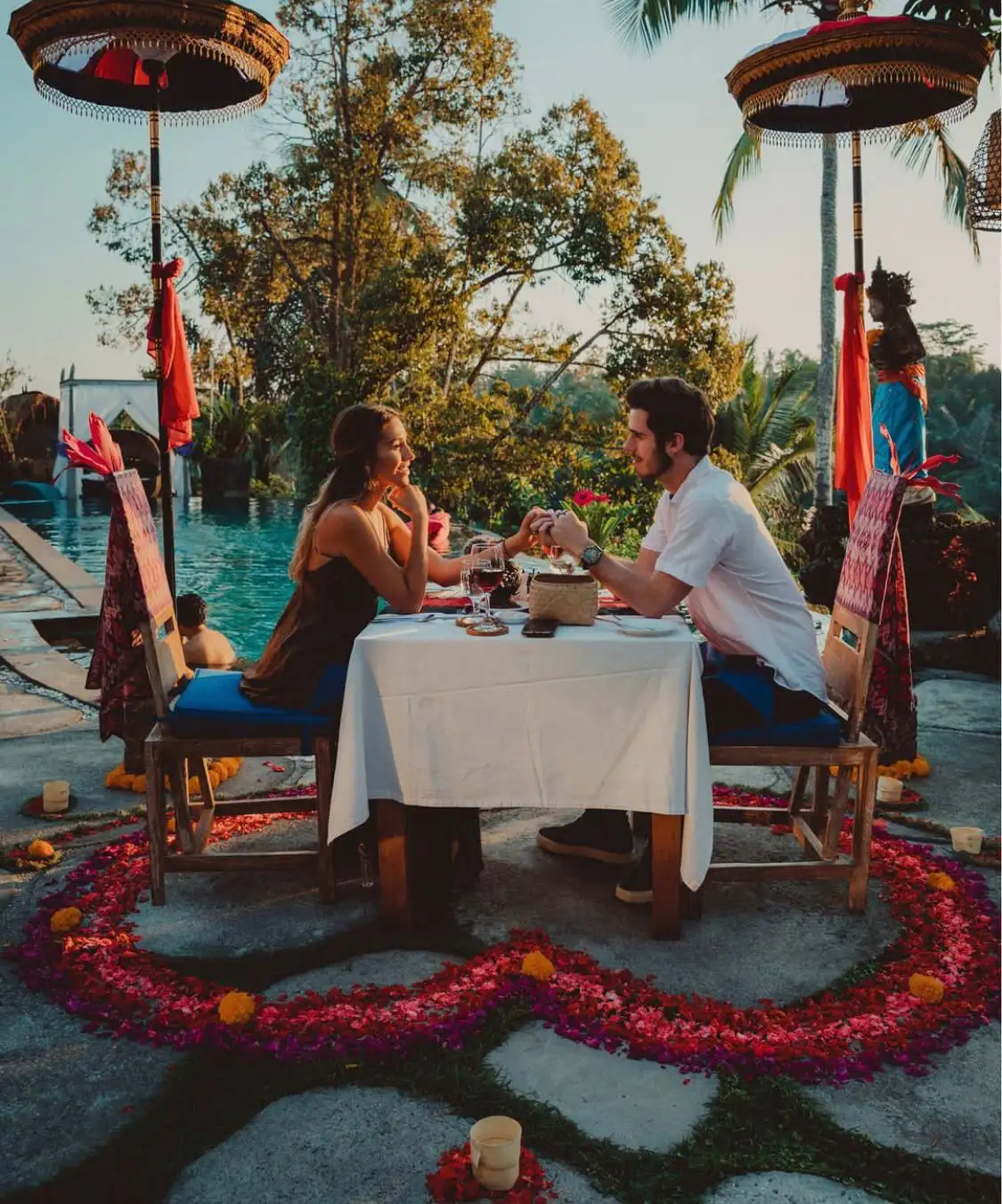 Discover Bali's enchanting spirit with our "Eat Pray Love Bali Packages Tour." Immerse yourself in the local culture through a cooking class, purification ritual, and a healing session with a traditional healer. To add a romantic touch, you can choose from options like a floating breakfast, a soothing flower bath spa, or an intimate dinner. Experience Bali's magic in a truly unique way.